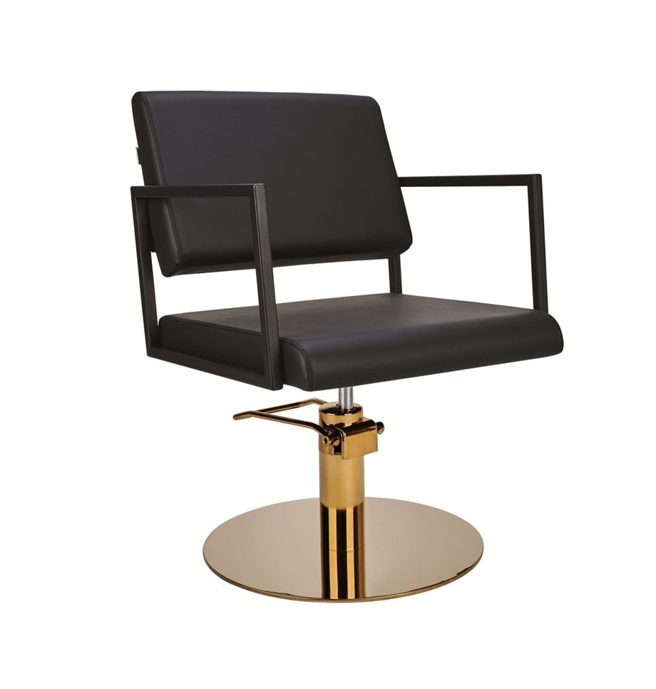 💺 Brațele metalice negre, vopsite în câmp electrostatic, adaugă rezistență și subliniază designul loft-industrial, în timp ce pompa hidraulică aurie permite ajustarea lină și ergonomică a înălțimii. Este combinația perfectă pentru hairstyliștii care doresc eficiență maximă și flexibilitate.